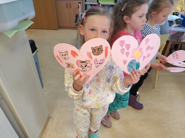 Hlavním programem pátečního dopoledne bylo tvoření srdíček z papíru. Každé srdíčko, které vzniklo, bylo jedinečné. Některé byly zdobeny jemnými vzory, jiné byly plné barev a veselých motivů. Všechna ale měla společný cíl – přinést úsměv na tváře všech, kteří se na jejich tvorbě podíleli. Děti nám na rozloučenou zazpívaly písničky o Písku a za to byly odměněny potleskem a sladkostí.