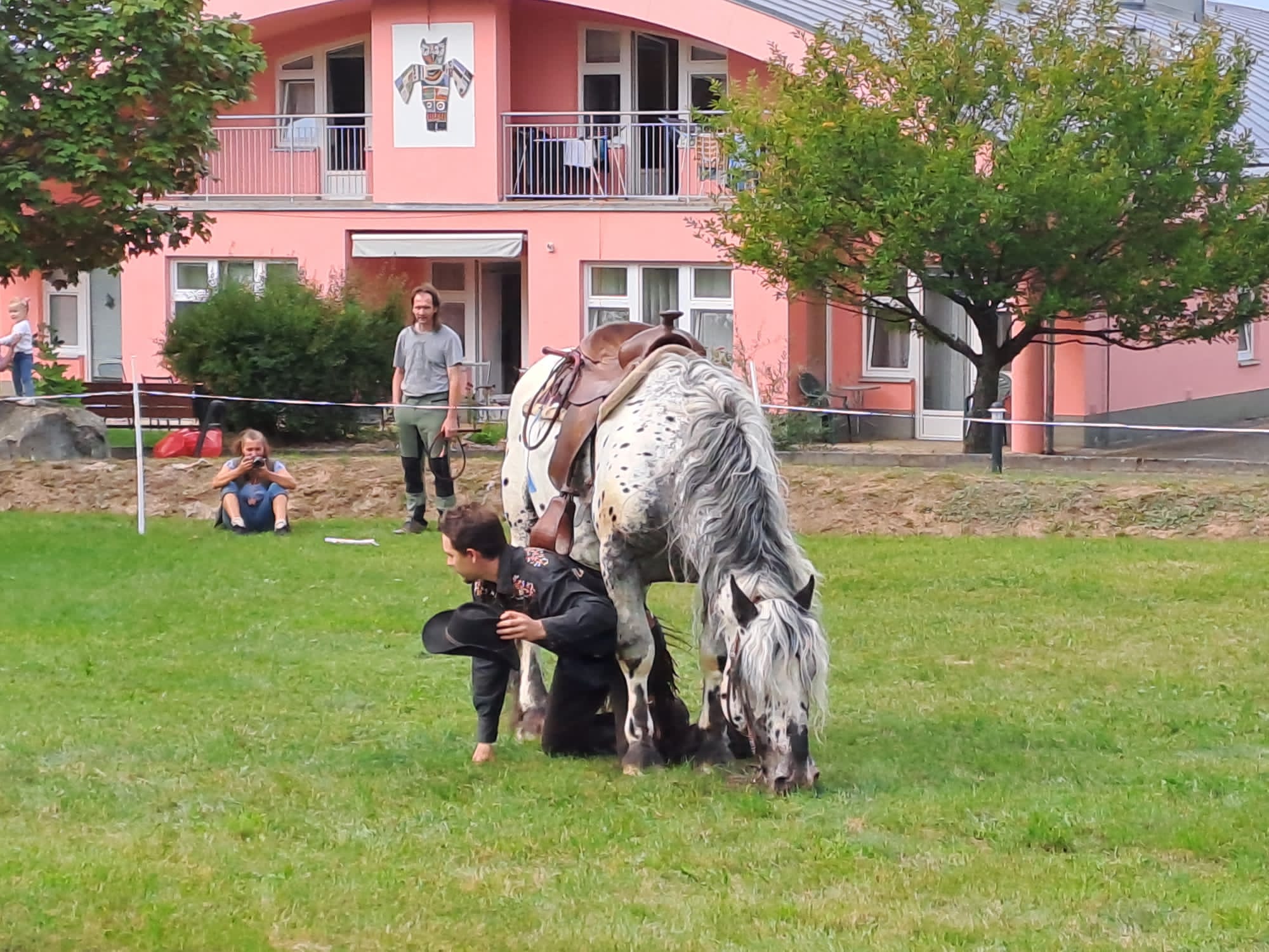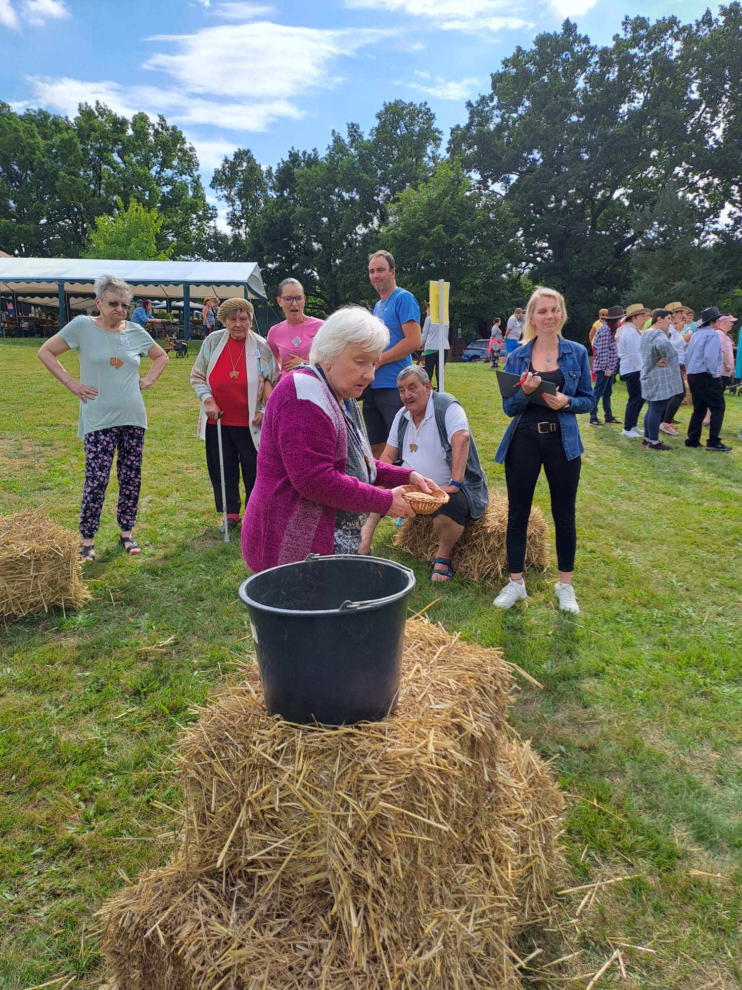 13. Westernový den v domově PETRA Mačkov. Tak na této každoročně pořádané, velice oblíbené akci jsme s našimi klienty nemohli chybět. Šest odvážlivců se utkalo s dalšími deseti družstvy z různých organizací v šesti disciplínách – převážení slámy kolcem skrz záludnou trať, sbírání vajec, krmení koní, házení podkovy na terč, trefování se pytlíčky do díry a shazování lahví bičem. V těchto disciplínách se naši závodníci prostřídali a každý si minimálně jednu z nich vyzkoušel. Za dobře odvedenou práci na stanovištích se klienti posílili klobásou a pivem. Ke slehnutí nesměla chybět ani káva a zákusky, ať už sladké či slané. Všichni si odpoledne užili a s pomyslnými medailemi s hlavou koně na krku odjížděli spokojeně zpět na zámek. Tímto děkujeme za perfektně zorganizované odpoledne, plné westernových vystoupení, tematických soutěží, hudby a dobrého občerstvení. Těšíme se na další, jistě vydařené ročníky.