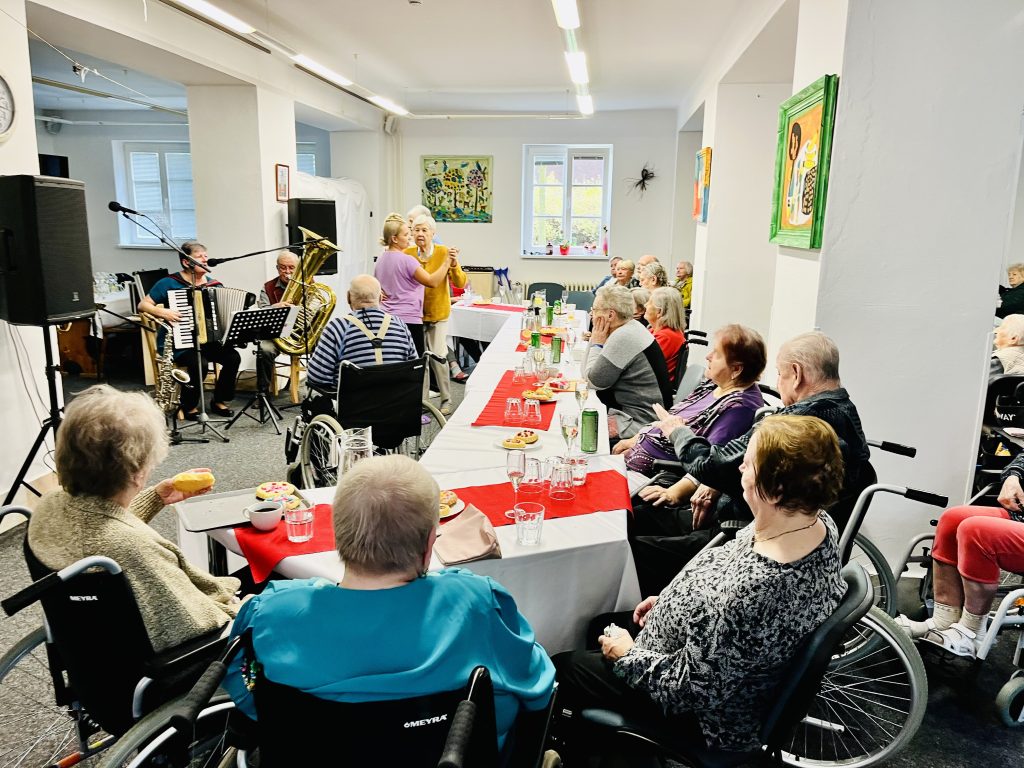 Ve čtvrtek 16. října si klienti při besedě s aktivizační pracovnicí Evou popovídali na téma posvícení. Vzájemně sdíleli své osobní zážitky a vzpomínky na tyto hody. Bylo to velmi obohacující a poučné setkání. Odpoledne se pak v našem společenském sále, jako vyvrcholení celého týdne, konala Havelská zábava. K tanci a poslechu hrála kapela Písecká čtyřka, která známými písněmi vykouzlila úsměvy na tvářích klientů. Někteří z nich si s radostí zatančili a zavzpomínali na staré časy. Pohoštění při této skvělé akci samozřejmě tvořily hnětynky od našich klientů.