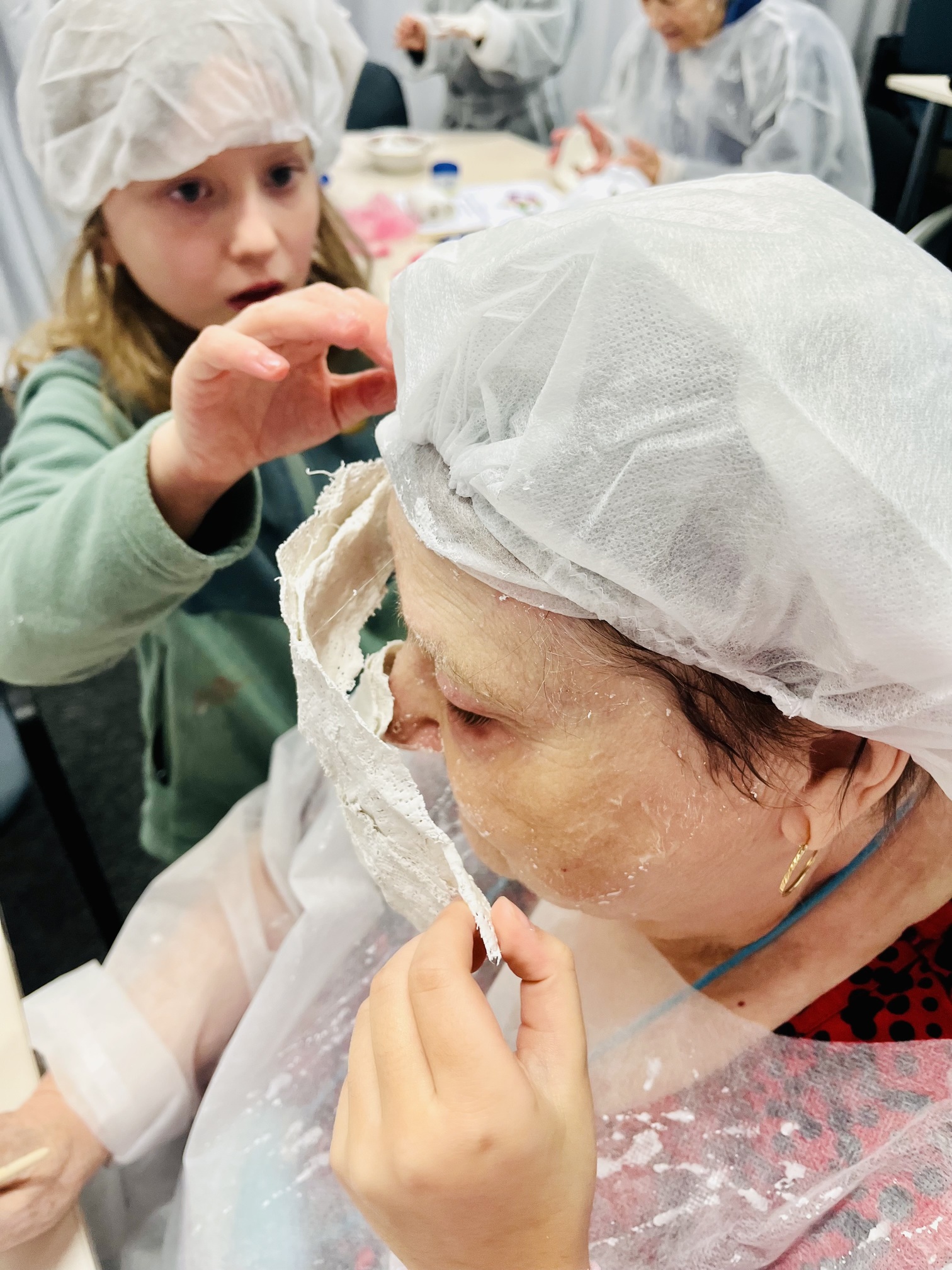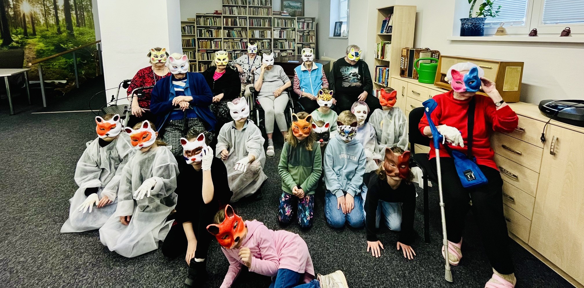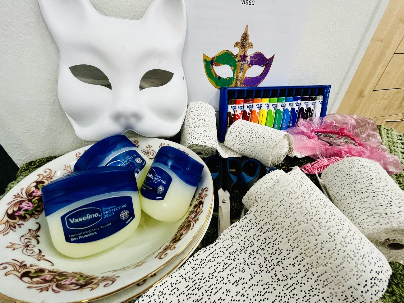 Dnešní mezigenerační setkání se neslo v duchu karnevalu – v Čechách nazývaném Masopust. Děti z MŠ a ZŠ Čížová se tentokrát společně pustili do výroby masek ze sádrových obvazů metodou vrstvení. Někteří senioři dětem ochotně dělali figuranty a děti na oplátku přinášely tvůrčí zápal, jemnost a pečlivost. V naší „dílně“ tak vznikla atmosféra vzájemné důvěry – kdy se starší generace „svěřila do rukou“ té nejmladší. Protože vyrobené masky delší dobu tvrdnou, měli jsme připravené i polotovary masek a ty si děti a senioři společně ozdobili, každý podle své fantazie, pestrými barvami.