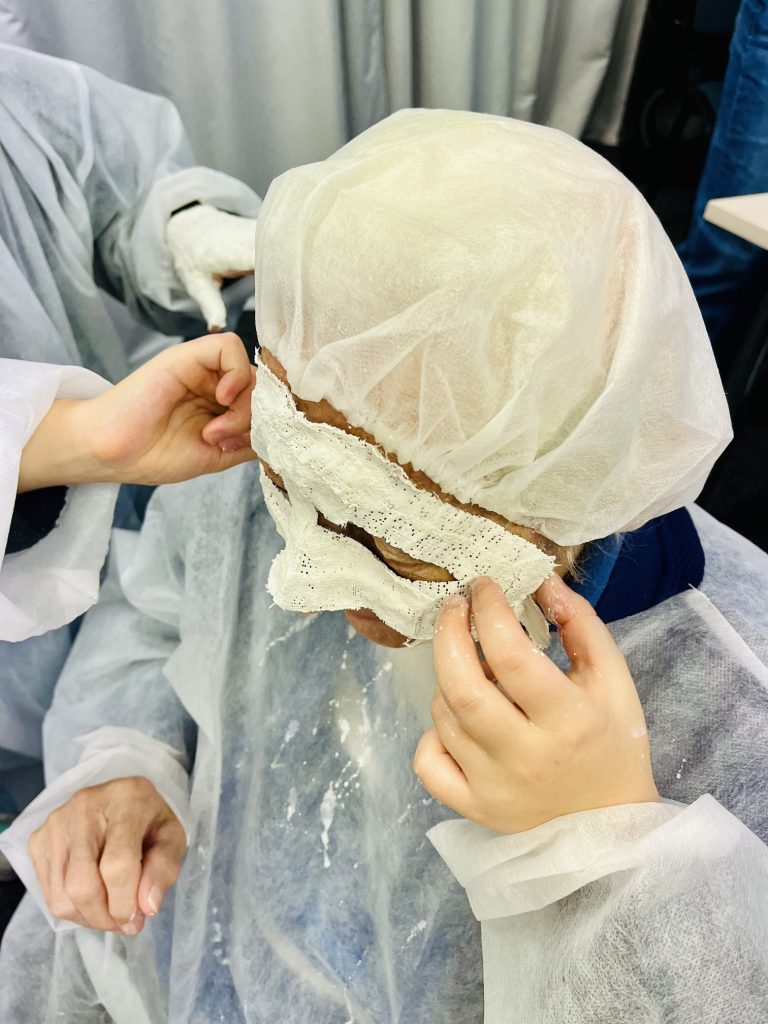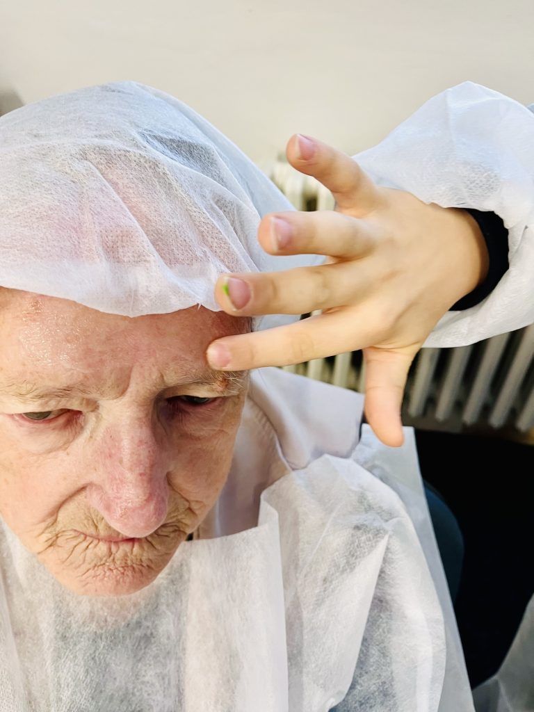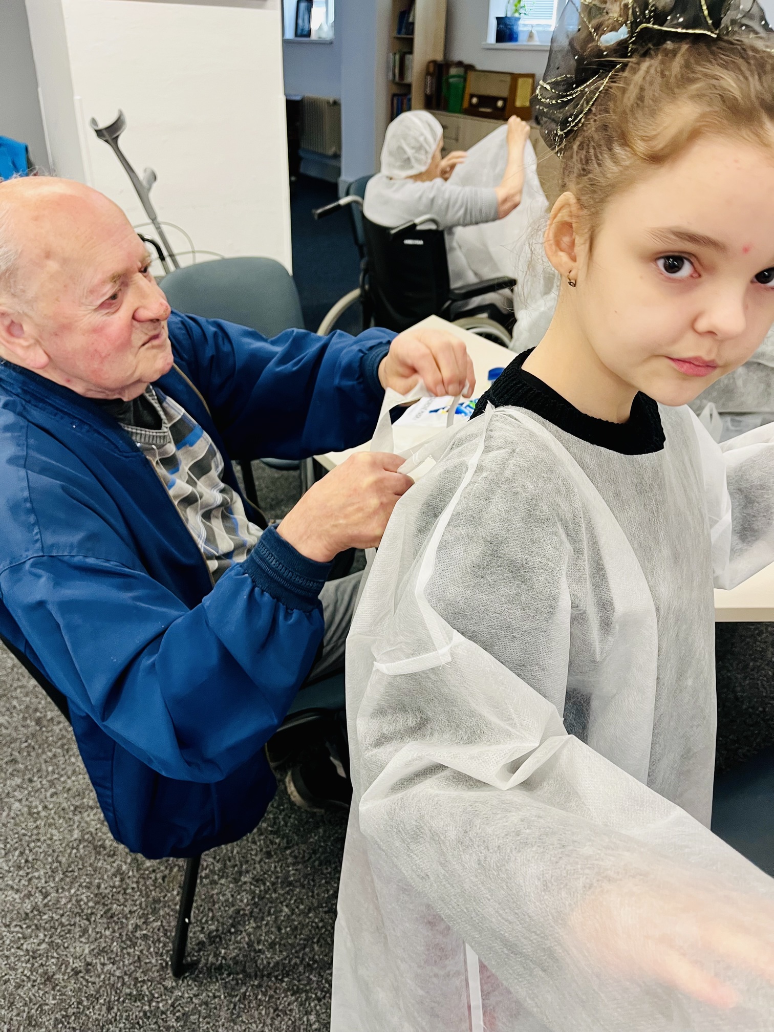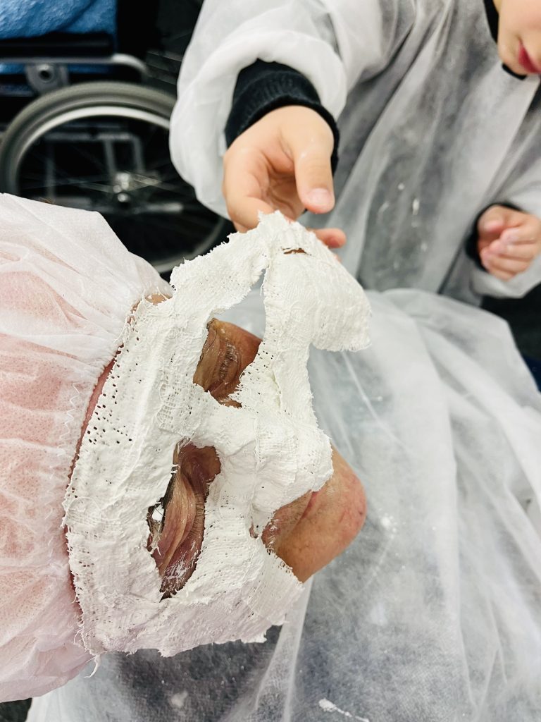 Dnešní mezigenerační setkání se neslo v duchu karnevalu – v Čechách nazývaném Masopust. Děti z MŠ a ZŠ Čížová se tentokrát společně pustili do výroby masek ze sádrových obvazů metodou vrstvení. Někteří senioři dětem ochotně dělali figuranty a děti na oplátku přinášely tvůrčí zápal, jemnost a pečlivost. V naší „dílně“ tak vznikla atmosféra vzájemné důvěry – kdy se starší generace „svěřila do rukou“ té nejmladší. Protože vyrobené masky delší dobu tvrdnou, měli jsme připravené i polotovary masek a ty si děti a senioři společně ozdobili, každý podle své fantazie, pestrými barvami.
