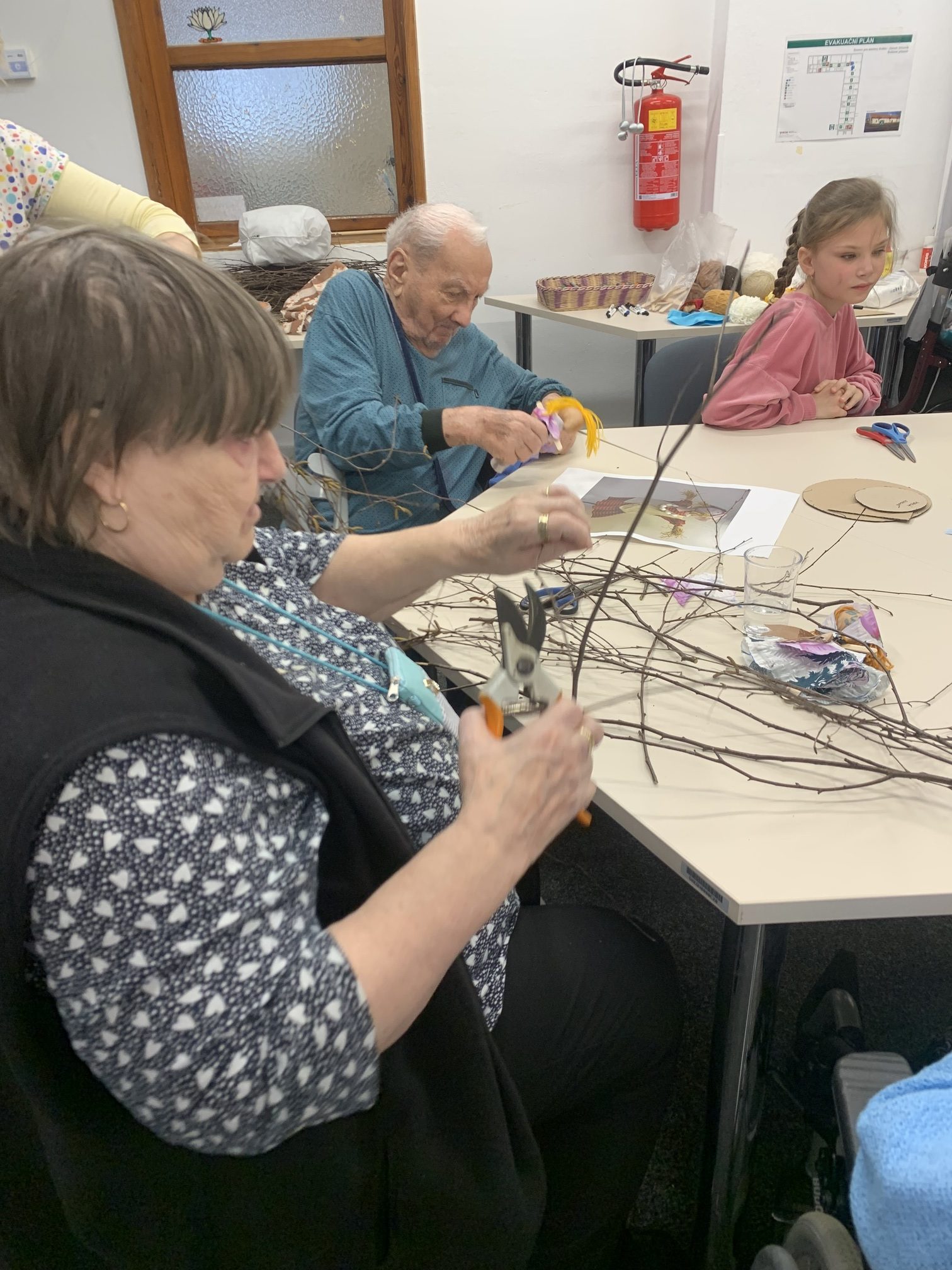 Na začátku setkání nám nejprve děti pod vedením paní učitelky Jitky Průchové a Ivy Spěšné zazpívaly tři písničky o „Smrtce“ Moreně a o jaru. Tím nás všechny uvedly do tématu dnešního setkání a už začalo se tvořit. Při práci se děti postupně i rozpovídaly a nakonec z toho bylo velmi příjemné setkání napříč generacemi. Na závěr nás děti obdarovaly milou jarní pozorností.