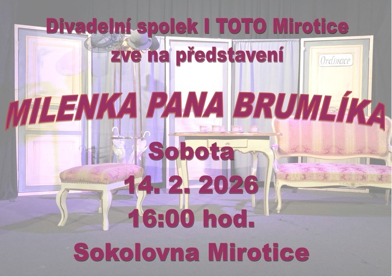 Kdy jindy návštívit divadelní komedii Milenka pana Brumlíka než právě dnes? Naši senioři se bavili při hře plné záměn, omylů a nedorozumění, na kterou je pozvali herci z Divadelního spolku I TOTO z Mirotic. Pro klienty byla návštěva představení nejen kulturním zážitkem, ale také příležitostí strávit dnešní podvečer netradičně. Navíc nám dnešní „Valentýnské“ představení připomnělo, že láska může mít i velmi komickou podobu.