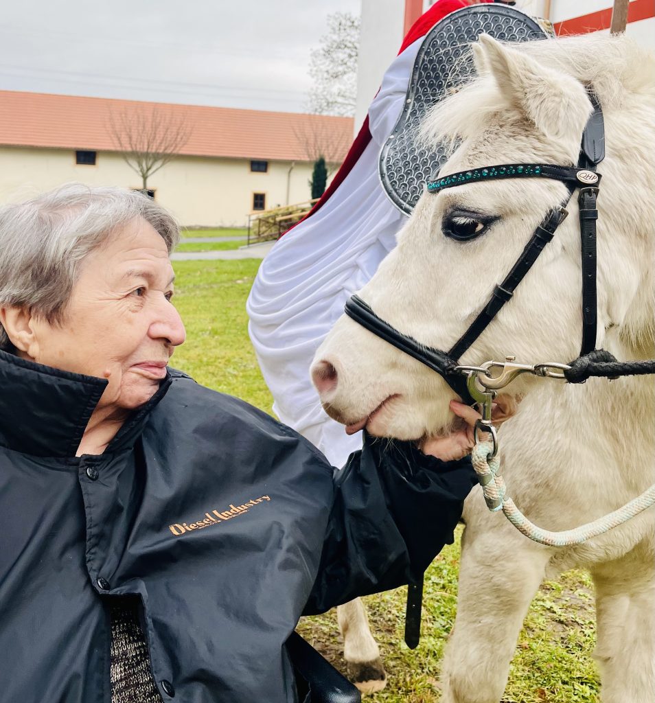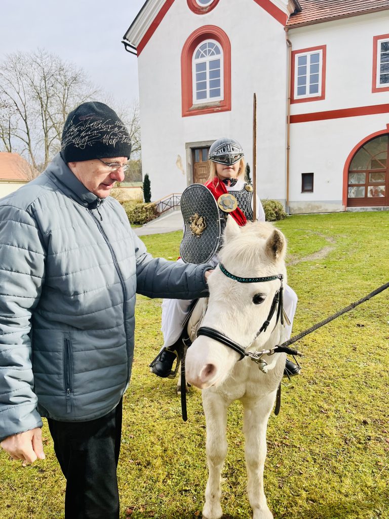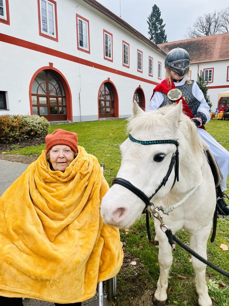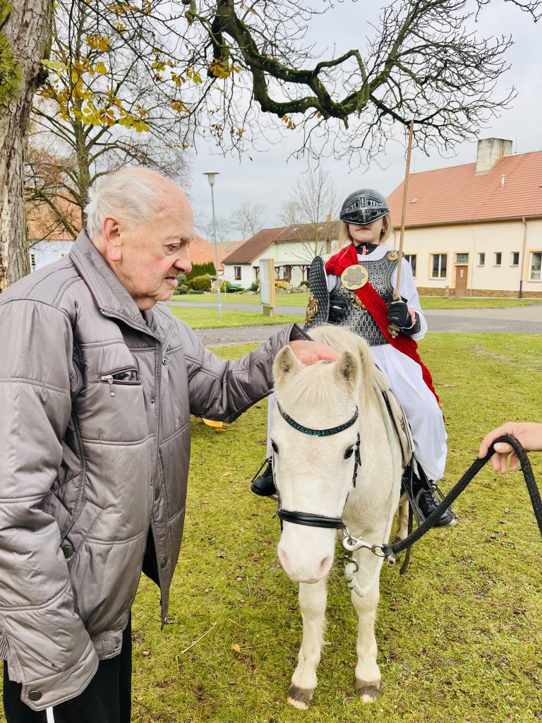 Dnes, 11. listopadu v dopoledních hodinách, k nám do našeho domova přijel Martin na bílém koni. Martinův bílý kůň symbolizuje jeho vojenskou minulost, čistotu a především lidové pozorování počasí, kdy přichází první sníh a s ním začátek zimy……… Sníh tedy dnes svatý Martin s sebou nepřivezl, zato přivezl pozitivní energii, kterou sdílel s klienty a zaměstnanci.