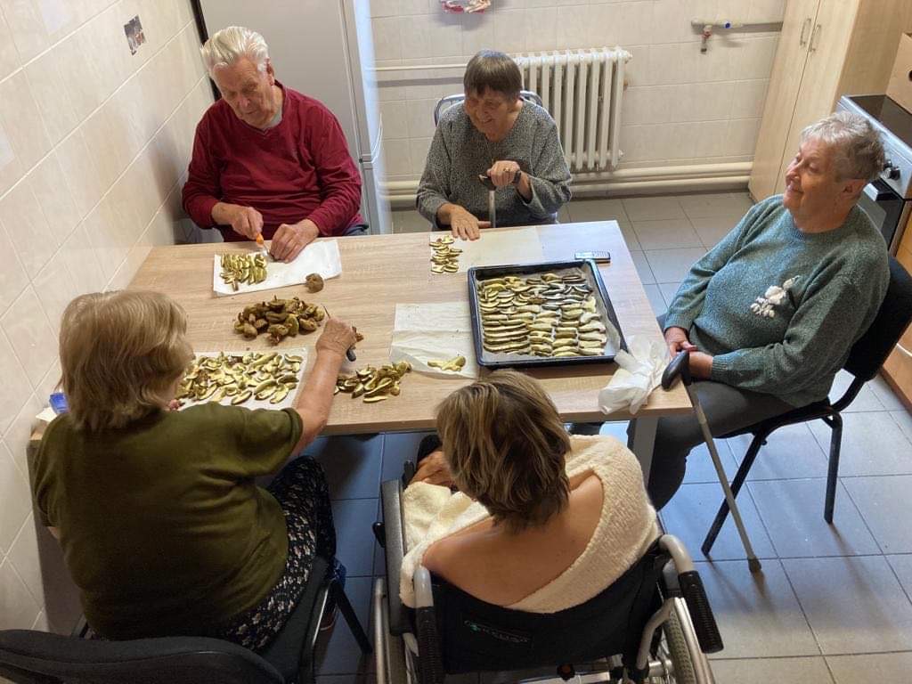 Letošní bohatá houbařská sezóna se nabízela k tomu, abychom si s klienty houbové radovánky připomněli i tady v domově. Košík plný hub nalákal klienty do kuchyňky, kde se s radostí pustili do práce. Menší houby klienti krájeli na sušení a z bedel se nadělaly řízky. Ty při smažení provoněly celý domov. Chuťové pohárky klientů byly odměněny degustací hotových řízků. Klienti se velice dobře bavili a nebyla nouze o jejich zajímavé a vtipné poznatky. Příjemné dopoledne bylo zakončeno dokumentárním pořadem o houbách a jejich sběru