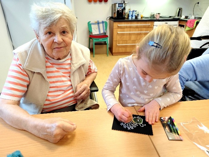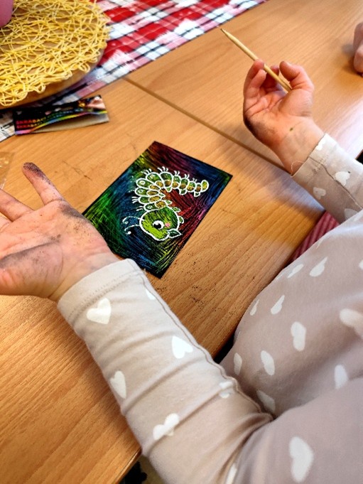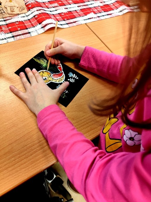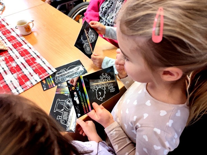 V pátek 19.12.2025 navštívily naše klienty děti z MŠ Šobrova s paní učitelkou. S nadšením a zápalem pro tvoření všichni spojili své síly. Dopoledne věnované tvorbě seškrabávání barevných obrázků bylo plné dobré nálady, kreativity a příjemných chvil. Na rozloučenou děti zazpívaly klientům vánoční písně a každý se odnesl na památku malý dáreček.Moc se všichni těšíme na příští společné setkání.