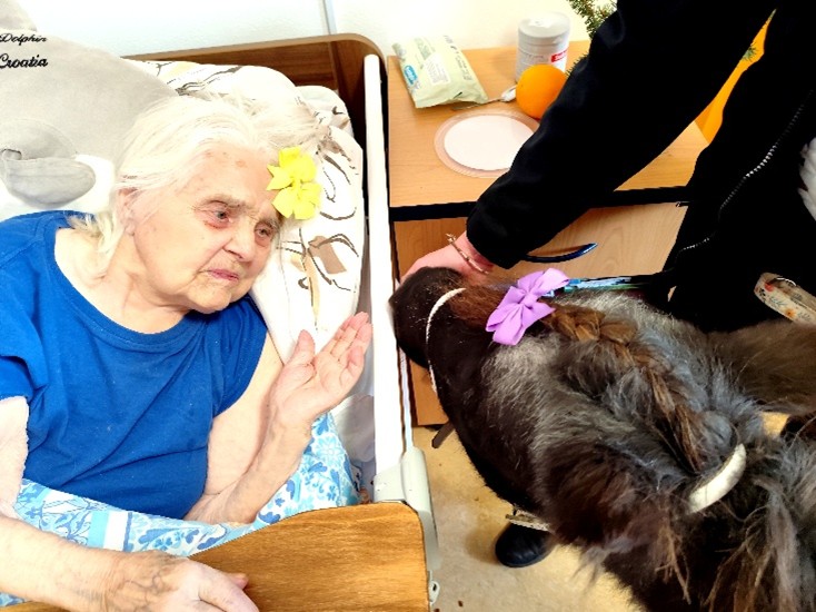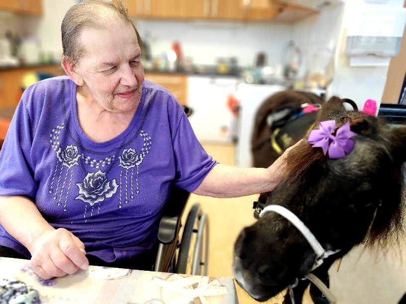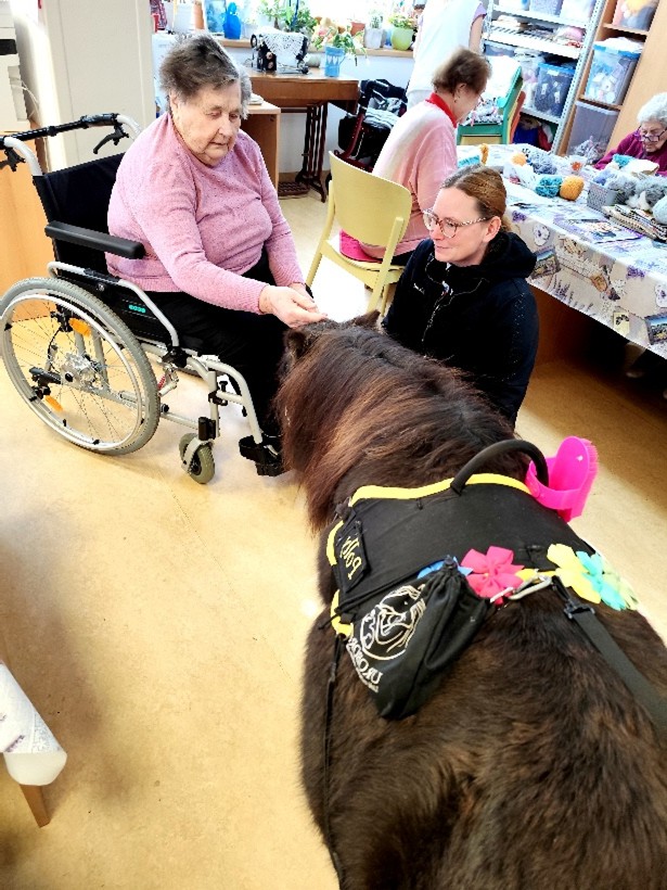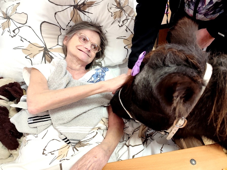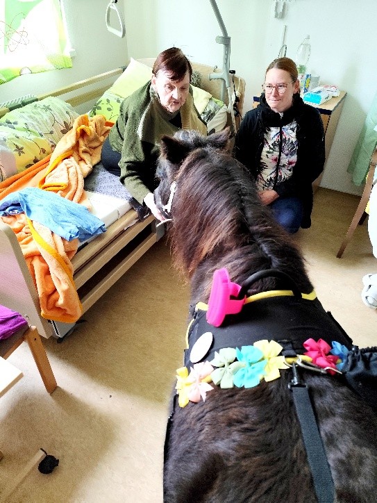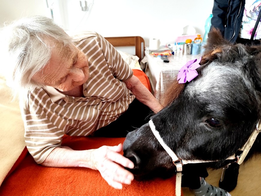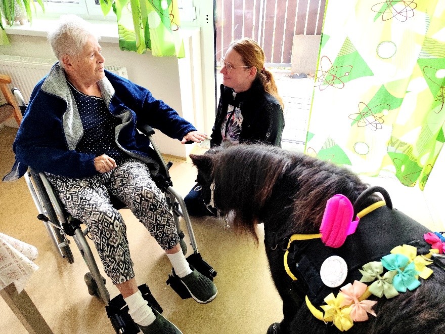 dne 5.11. jsme v domově opět přivítali Martinu Doležalovou s poníkem Polly, který vykouzlil úsměv na tváři našim klientům. Polly si hned získala pozornost všech, se kterými se setkala a návštěva proběhla ve velmi příjemné atmosféře – plné vzpomínek, smíchu a pozitivních emocí. Mnozí klienti se rozpovídali a svých vlastních zvířecích miláčcích. Polly si klienti mohli pohladit a ozdobit ji roztomilými mašličkami. Děkujeme spolku Uroboros za krásné chvíle.