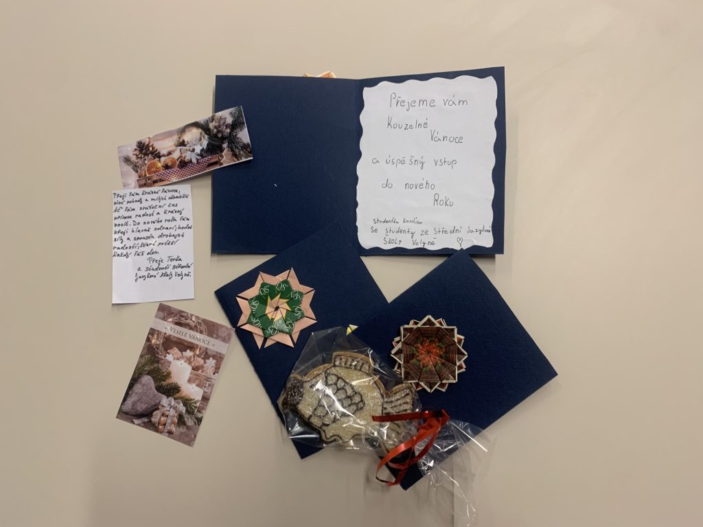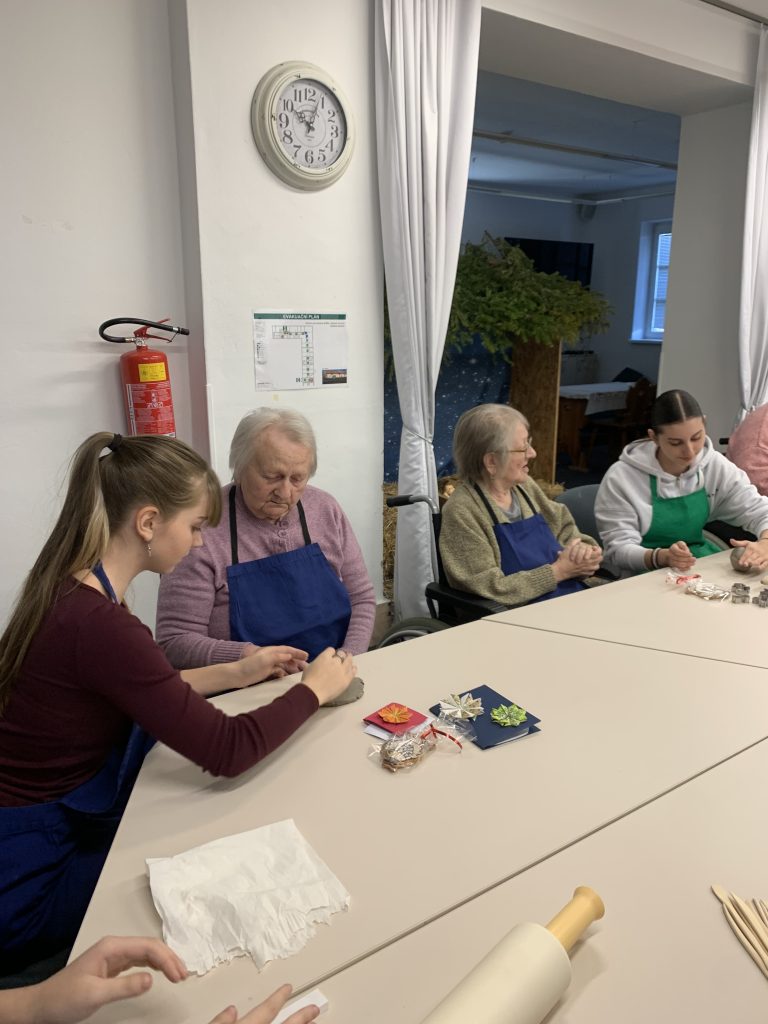 V úterý 9. prosince se v předvánočním čase v našem domově uskutečnilo milé setkání studentů a seniorů. Dopoledne u nás totiž strávily studentky ze Střední školy a Jazykové školy s právem státní jazykové zkoušky Volyně. Tentokrát jsme se sešli, abychom společně vytvořili vánoční dekorace z keramické hlíny a předali si navzájem kus sváteční nálady. Studentky našim seniorům udělaly radost krásnými vánočními přáníčky s origami dekoracemi a vánočními rybkami ze sladkého lineckého těsta. Celé dopoledne se neslo v přátelské a tvořivé atmosféře.